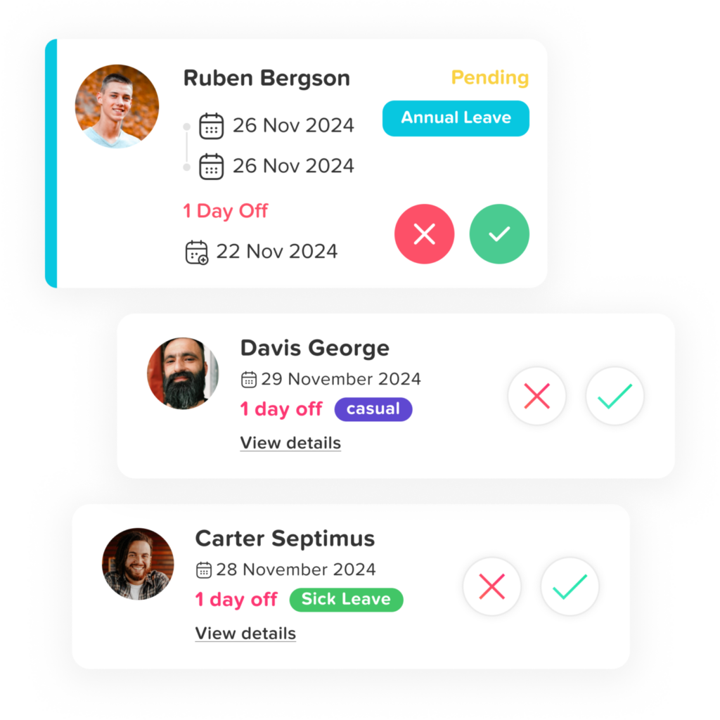 Managers can quickly review and approve leave requests while seeing who else in the team is already scheduled to be away. This helps them plan workloads and avoid situations where too many employees are absent at the same time.