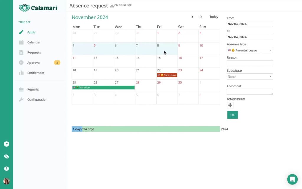 Calamari allows employees to submit leave requests quickly through web or mobile interfaces. The request process is straightforward, allowing users to select the leave type, choose dates, and submit the request within seconds.