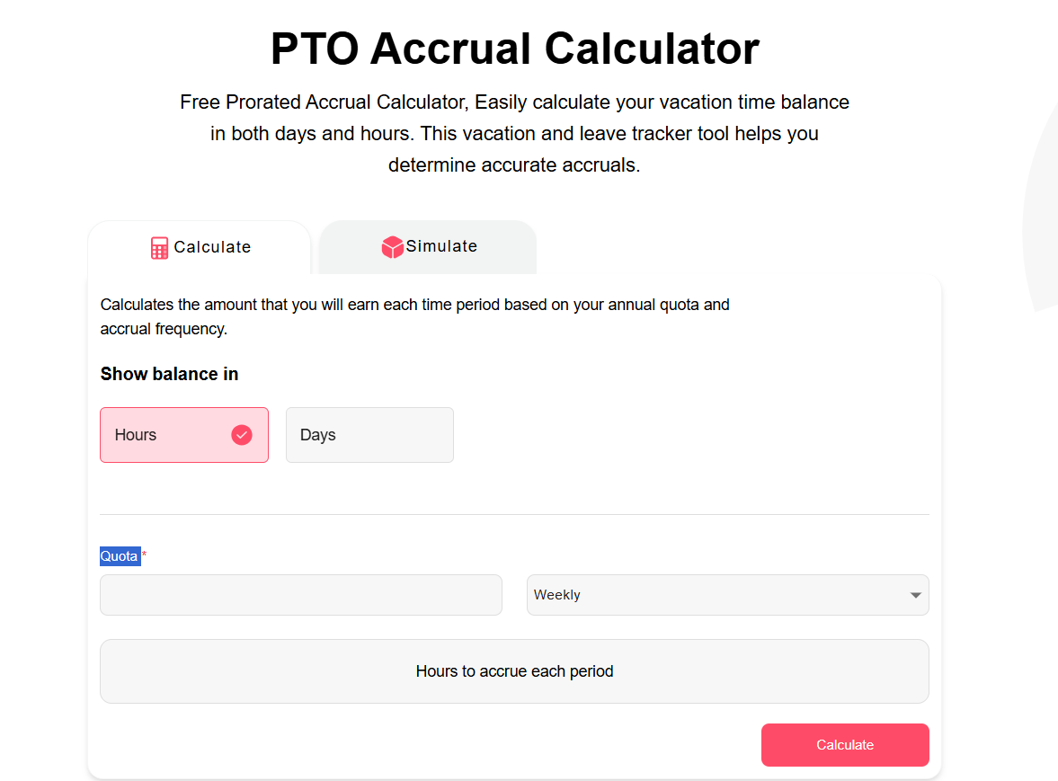 An accrual calculator, in the context of paid time off (PTO), vacation, or annual leave, is a specialized tool used to calculate how much time off an employee accumulates over a period. Instead of receiving vacation or PTO at once, employees typically accrue it gradually, daily, weekly, monthly, or based on hours worked, aligned with company policy. The accrual calculator streamlines this by automating all the math accurately.