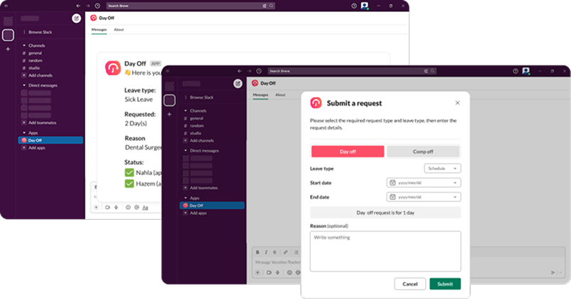 Bring Day Off directly into your daily workflow. With our Slack integration, you can sync your team, receive daily updates, and manage leave requests all within your favourite communication tool.