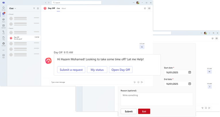 Streamlined Experience: Employees can view their balances and submit leave requests directly within Microsoft Teams, keeping communication and scheduling in one place.