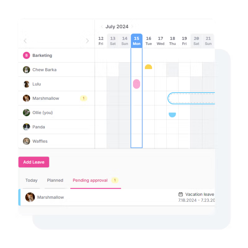 Approved leave can sync with Google or Outlook calendars so absences appear alongside meetings and scheduled events.