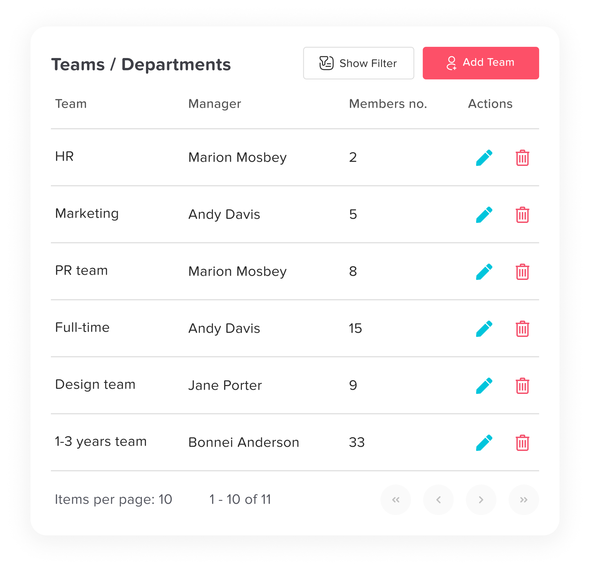 Falls Ihr Unternehmen aus mehreren Teams besteht, ist Day Off die ideale Lösung für Sie. Sie können eine unbegrenzte Anzahl an Teams hinzufügen, diese jederzeit bearbeiten oder auch löschen. Unsere Plattform bietet Ihnen zwei Möglichkeiten, Teams zu nutzen: entweder als Abteilungen Ihrer Organisation oder zur Erstellung individueller Teams, denen Sie benutzerdefinierte Abwesenheitsrichtlinien zuweisen können, die genau auf ihre Bedürfnisse zugeschnitten sind.