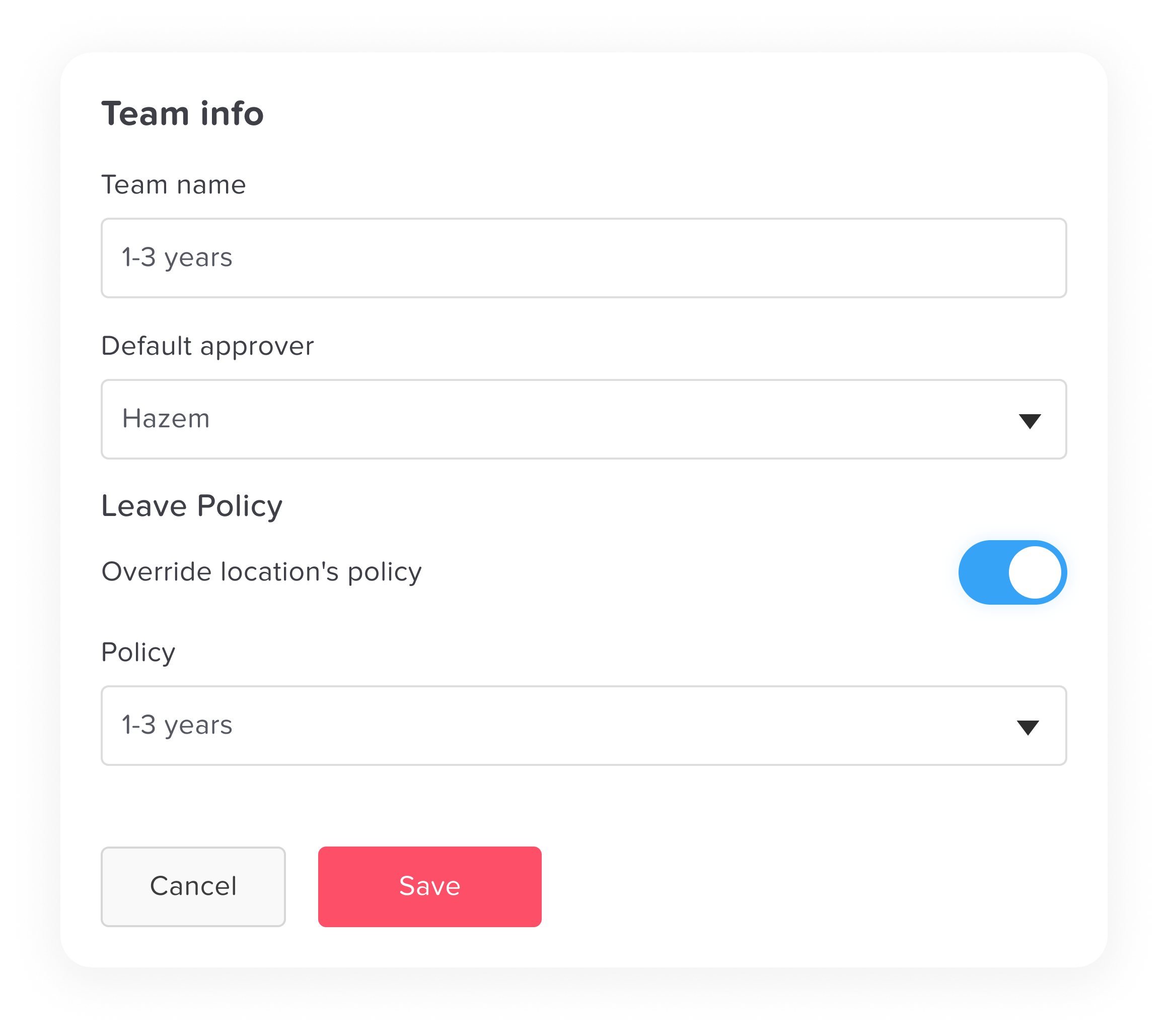 Beim Hinzufügen eines Teams müssen Sie lediglich den Teamnamen eingeben und einen Genehmigenden auswählen – also die Person, die für das Annehmen oder Ablehnen der Anfragen der Teammitglieder sowie für die Verwaltung ihrer Abwesenheiten zuständig ist.