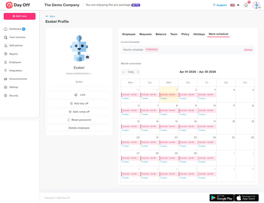 Wenn für den Mitarbeiter ein Stundenplan festgelegt ist, wird eine Kalenderansicht mit den Arbeitszeiten für jeden Tag angezeigt.