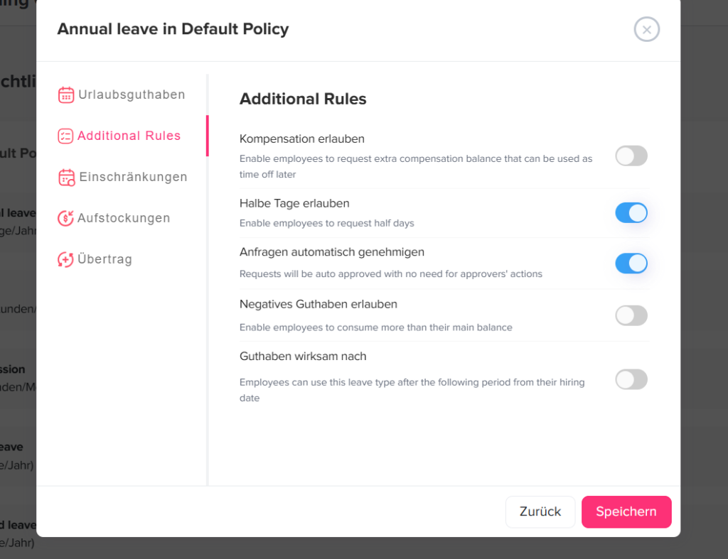 Legen Sie eine feste Anzahl von Tagen oder Stunden fest, erlauben Sie unbegrenzten Urlaub oder konfigurieren Sie die Ansammlung im Laufe der Zeit.Ansammlungsregeln