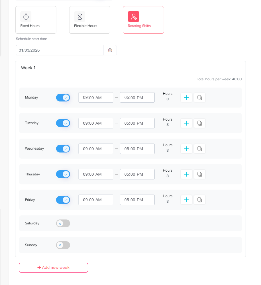 Day Off unterstützt wechselnde Schichten. Dies funktioniert ähnlich wie ein fester Stundenplan, ermöglicht es Administratoren jedoch, mehrwöchige Zyklen zu erstellen, in denen sich die Arbeitstage und -zeiten jede Woche ändern können.