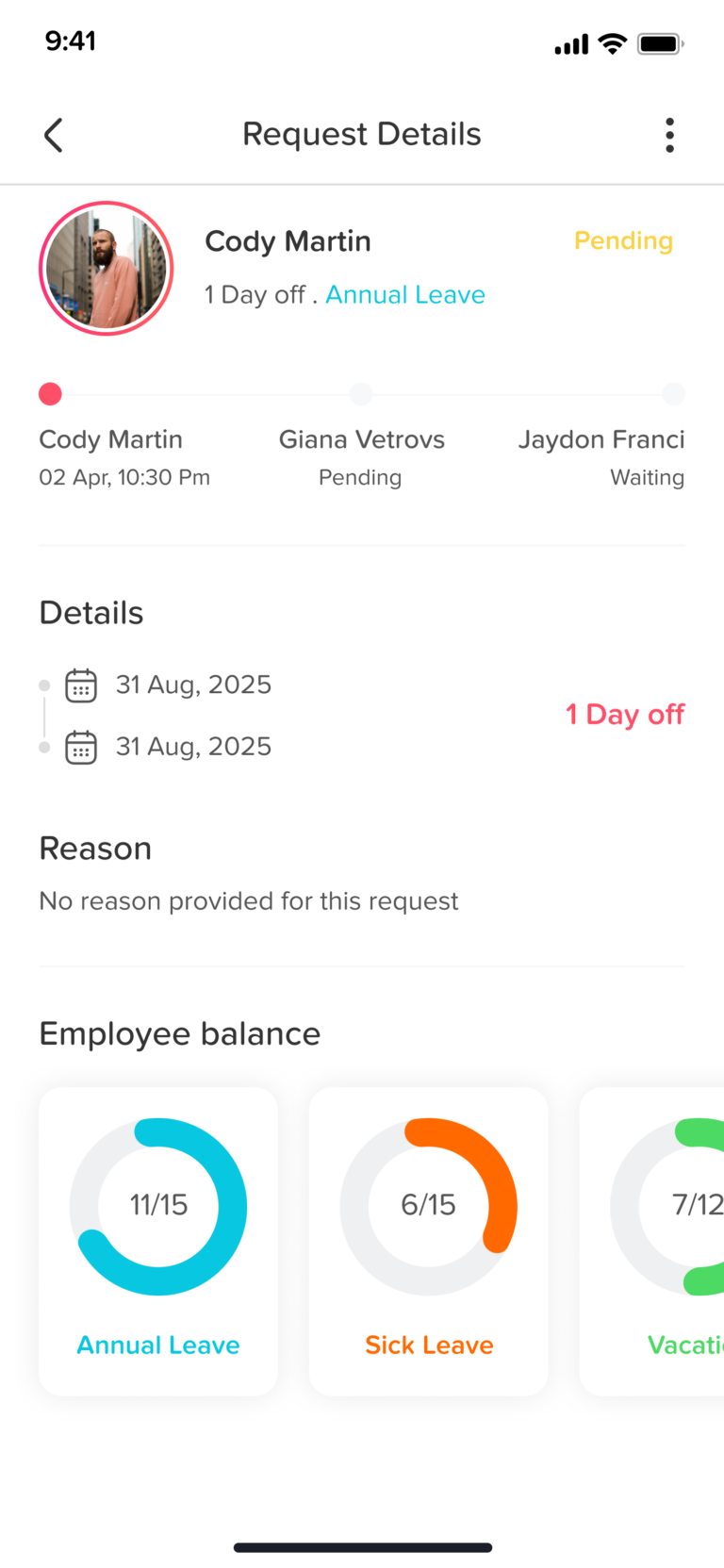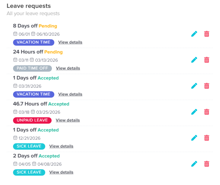 Scrollen Sie nach unten, um den vollständigen Verlauf aller von Ihnen eingereichten Anträge anzuzeigen. Zu jedem Antrag werden dessen Status (z. B. „Ausstehend“, „Angenommen“ oder „Abgelehnt“) sowie wichtige Details wie Daten und Urlaubsart angezeigt.Antragsdetails prüfen