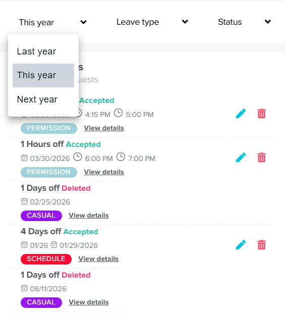 Oben auf der Seite finden Sie eine Filteroption, mit der Sie den Zeitraum ändern können. Damit können Sie Ihre Anfragen aus früheren Jahren anzeigen oder sogar die für das nächste Jahr geplanten Anfragen einsehen, was die Navigation zwischen verschiedenen Zeiträumen erleichtert.