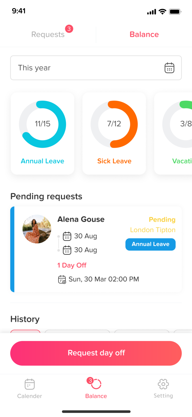 Wenn Sie Ihren Urlaubsverlauf einsehen, können Sie alle Ihre bisherigen und aktuellen Anträge im Blick behalten. So behalten Sie den Überblick und können Ihre Urlaubstage über verschiedene Zeiträume hinweg überprüfen.