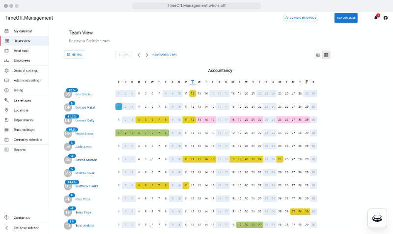 Calamari offers a visually clear calendar view where teams can see who is off on specific days, which helps prevent scheduling conflicts and ensures adequate staffing. Filtering options allow managers to check absences by team, location, or role, supporting better resource planning.