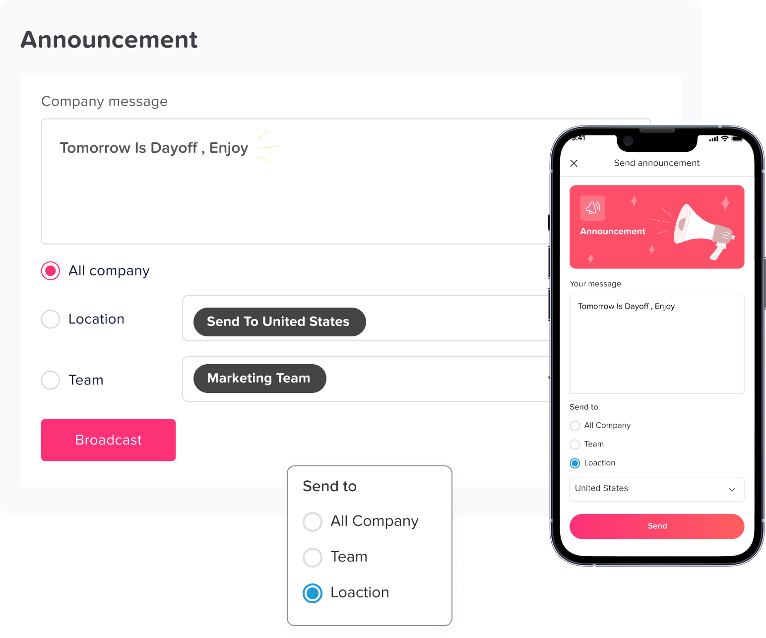 For more detailed options, you can select from three choices. If your announcement is intended for the entire company, choose ‘All Company’. This ensures that all employees are informed. However, if your announcement is specific to a particular team, simply select that team to target your message. Similarly, if you want to send the announcement to a specific location, choose that location and then click ‘Send’.
