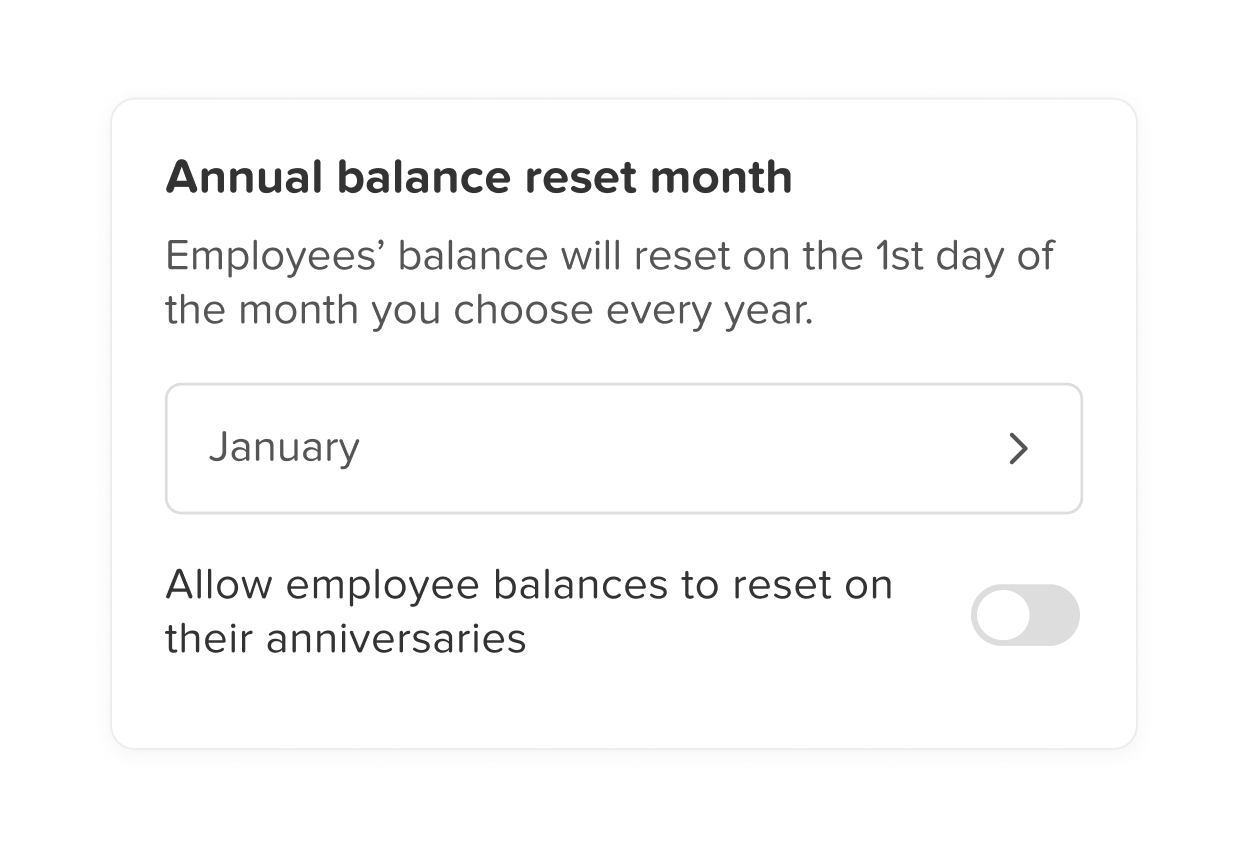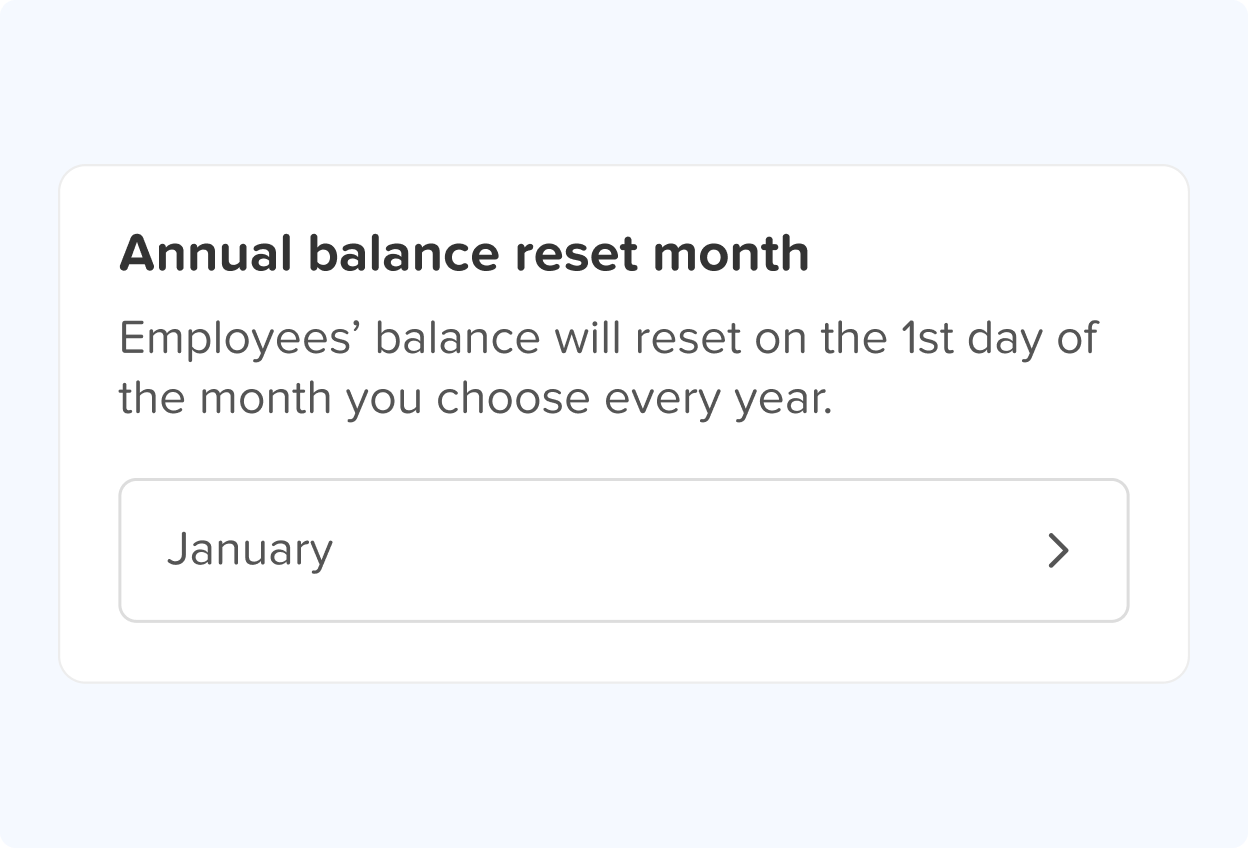 You can easily choose a specific month for your employees’ balances to reset. For instance, if you select January, all employees’ balances will reset on January 1st. This reset marks the beginning of a new working year and accrual cycle.