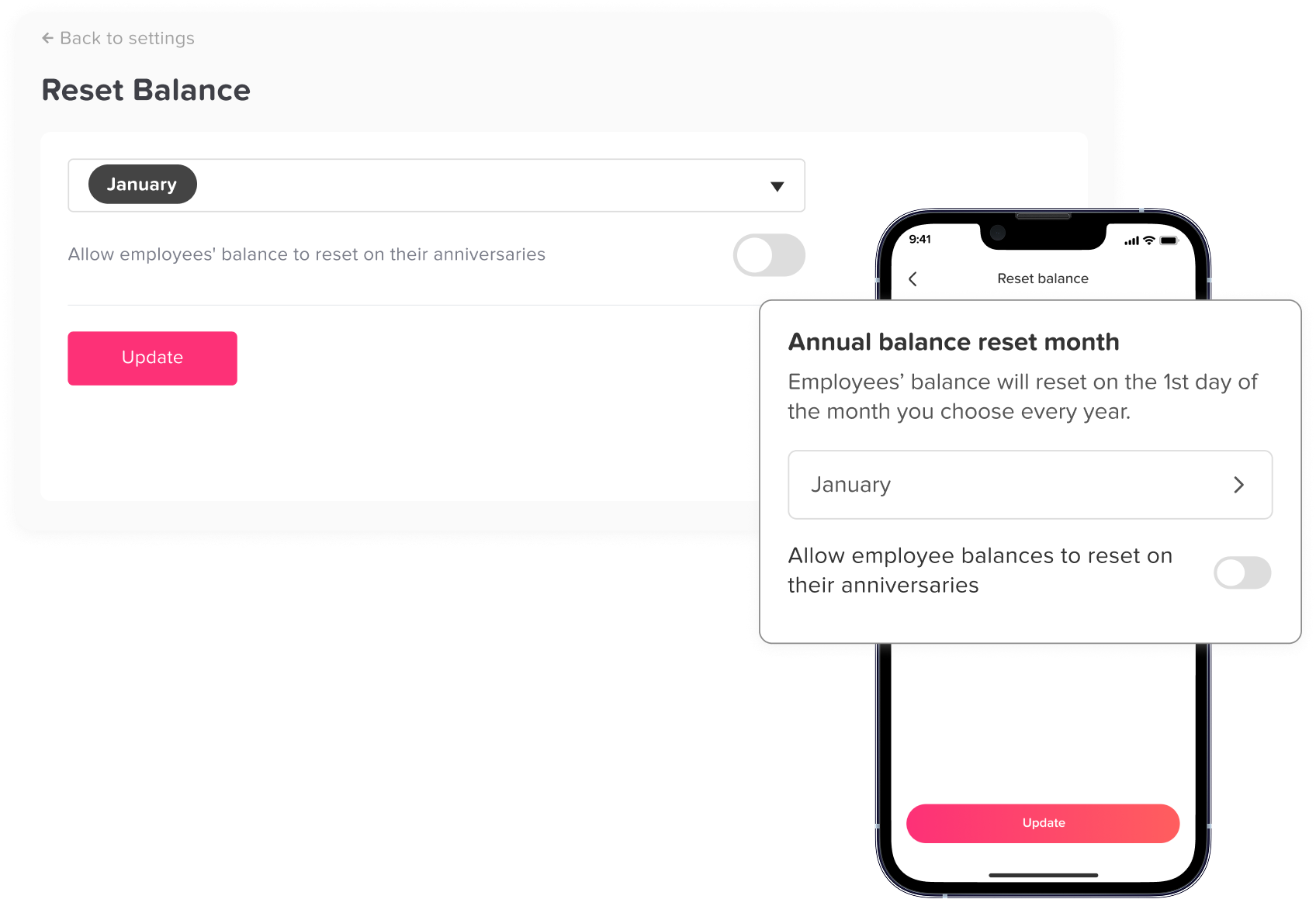 Balance Reset offers flexibility in managing leave balances by allowing admins to choose a specific month for resetting balances or to reset them based on employees’ anniversaries.