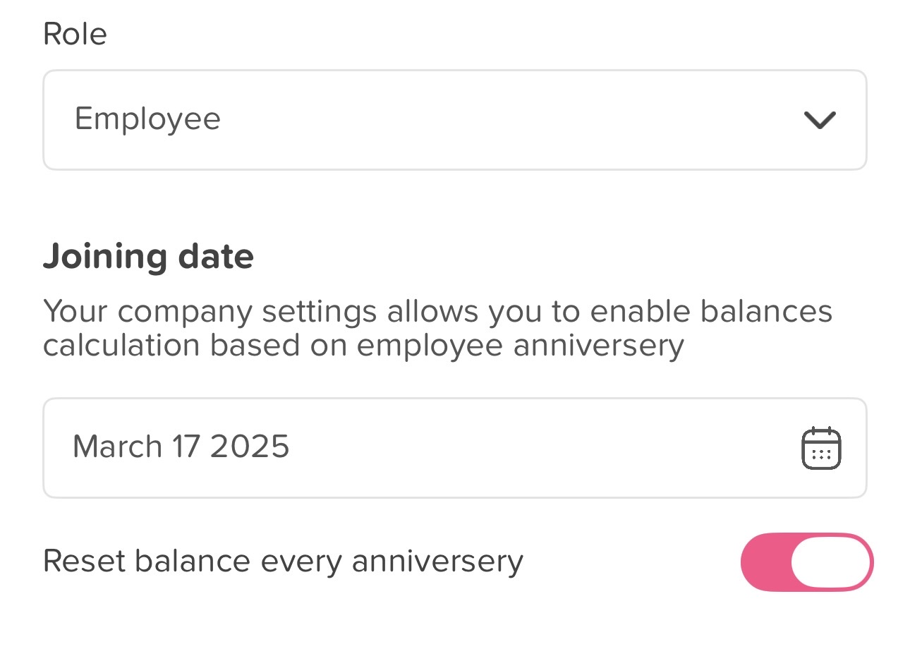 For employees whose leave resets based on their joining date, you can enable this option in the annual reset settings. This ensures each employee’s balance and working year automatically reset on their anniversary, simply enter their joining date to activate it.