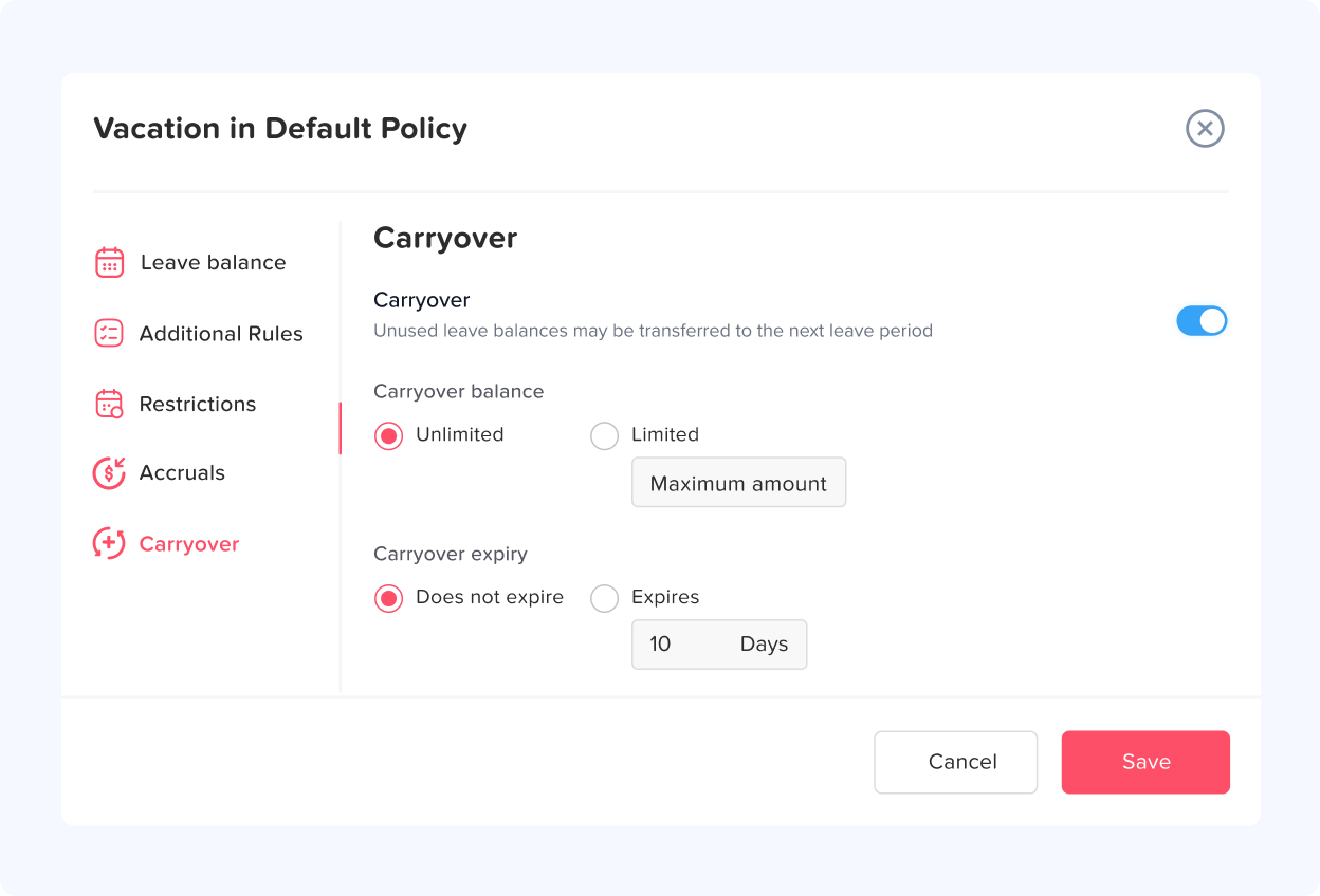 If an employee has a balance left, and you activate the carryover feature, you can either allow them to carry over their entire remaining balance without restrictions or set a limit by specifying a certain number of days or hours that can be carried over. You can also choose whether this limit should have an expiration date or not. If you decide to set an expiration date, you will need to specify the number of days after which the carried-over balance will no longer be usable by the employee in the upcoming year.