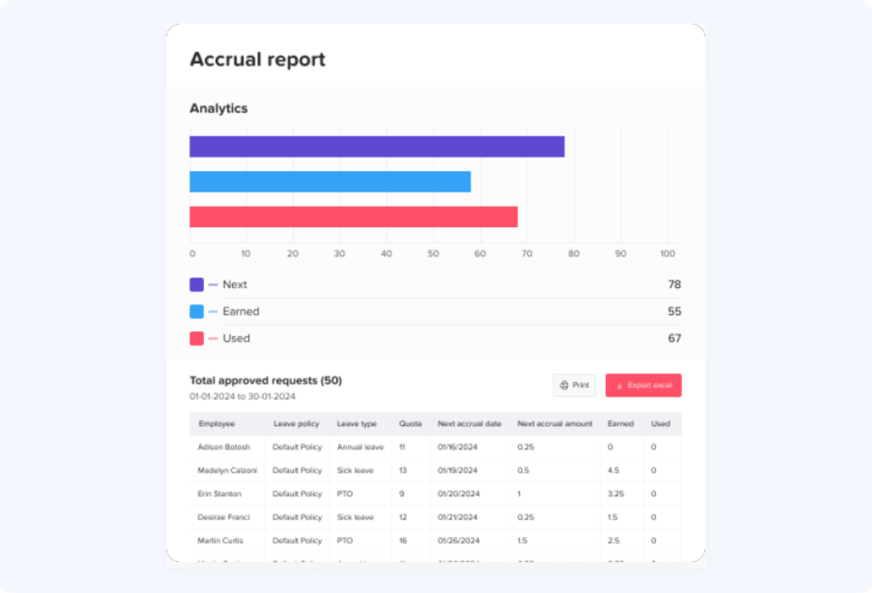 For more data, you can access the accrual reports, accrual reports provide an in-depth look at how each employee’s leave balance builds up over time, you can see the whole quota of the employee how much he earned, and when he will earn his next amount.
