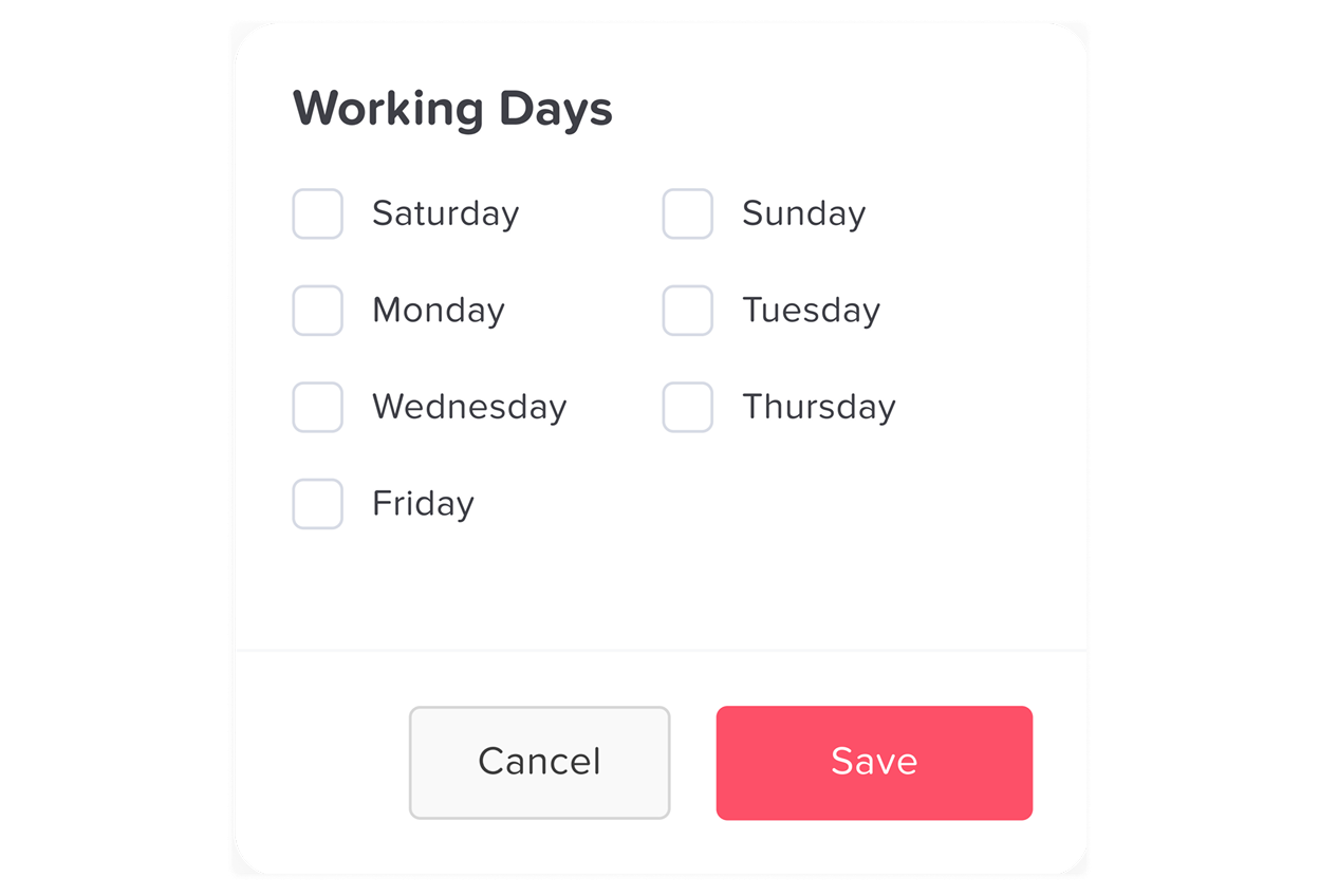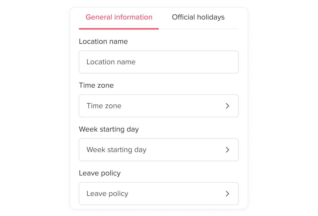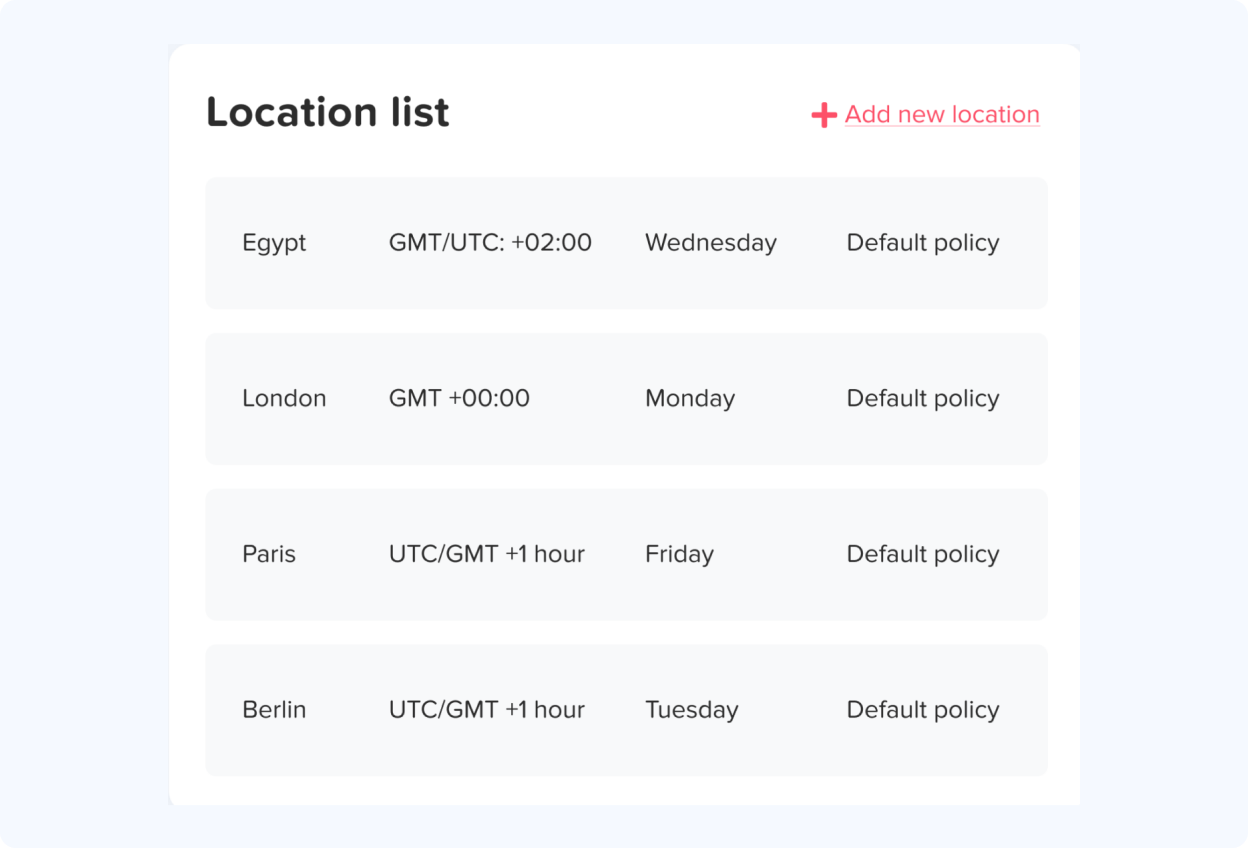 Different locations may have different working days, so you can choose the start day of each week as well as the working days and weekends while navigating each location’s settings. You can also import the official holidays for each location and have the
