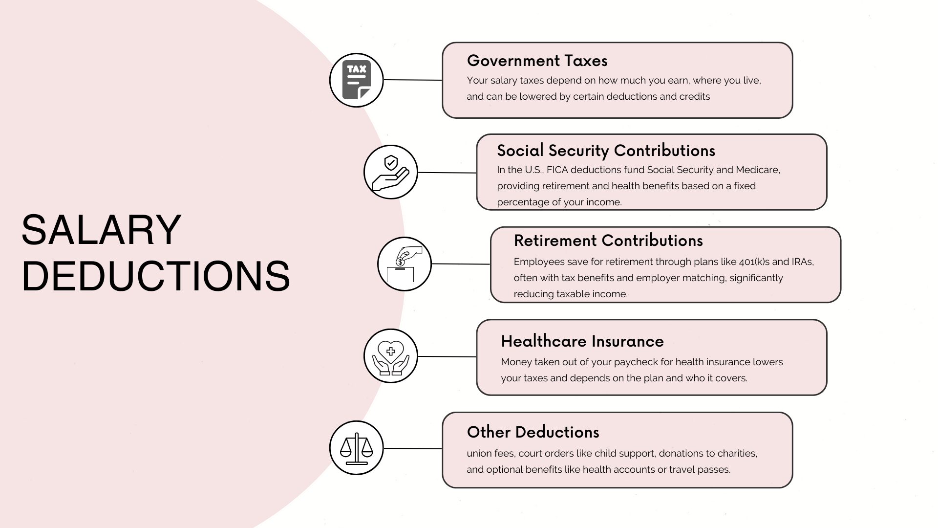Taxes represent one of the largest categories of deductions from your gross salary. The amount of tax you owe depends on your income level and your tax filing status, and it can include federal, state, and sometimes local taxes. Here’s how they work:
