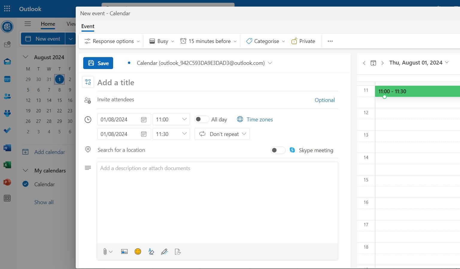 Event Title: Enter a clear, descriptive title such as “Out of Office,” “Vacation,” or “Business Trip.” This appears on your calendar and in any invites, making your unavailability immediately clear.