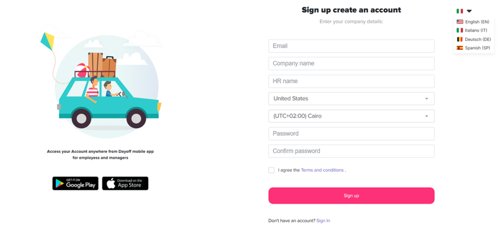 Creating a company account on Day Off is a straightforward process. Each step is designed to collect the basic information needed to set up your workspace correctly from the start.