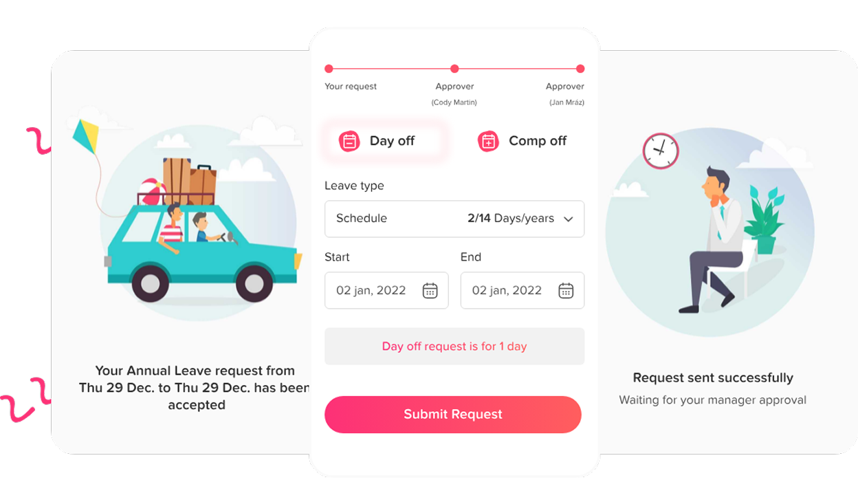 With Day Off, managers handle time off requests in Slack or Teams, employees track balance and submit time off, all synced with Google, Outlook, and your tools via API.