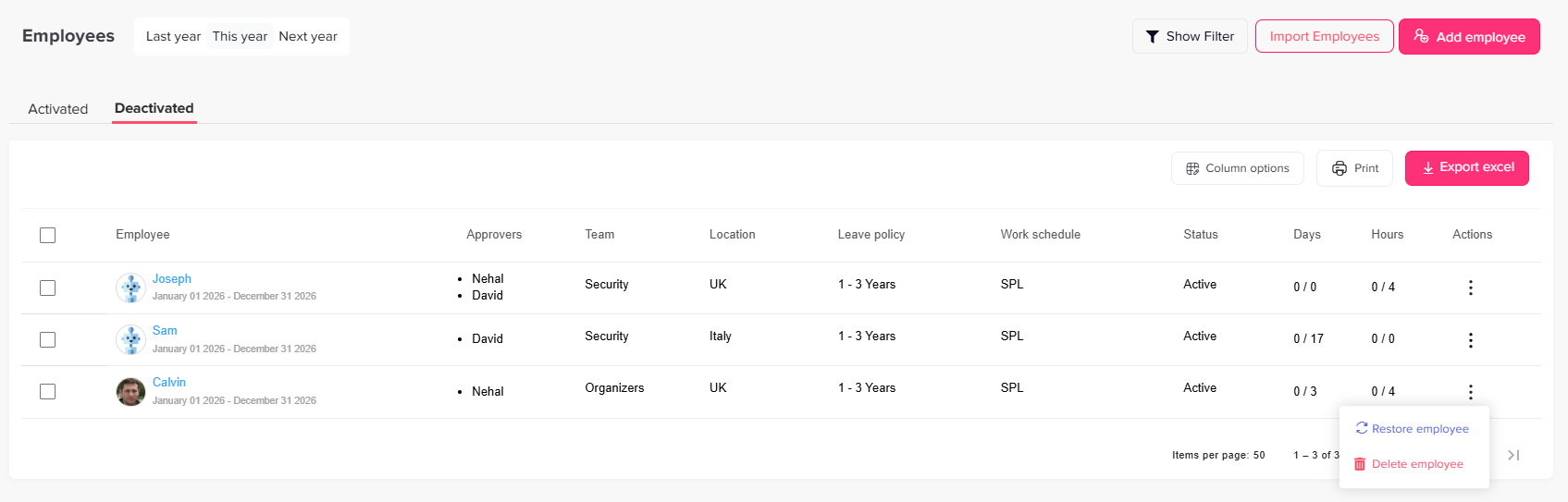 This feature allows schools to exclude inactive staff from leave tracking, accrual calculations, approval workflows, and reports without permanently deleting their records. Deactivated employees do not accrue leave, cannot submit requests, and are not counted in active headcount or balance reports during the deactivation period. Once the new academic year begins, employees can be reactivated with their historical data fully preserved.