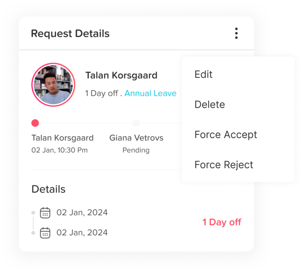 Employees can submit vacation, PTO, sick leave, or custom time off requests through intuitive web and mobile interfaces in just a few clicks. Managers and HR teams receive instant notifications, ensuring requests are reviewed promptly without relying on emails, chats, or spreadsheets.