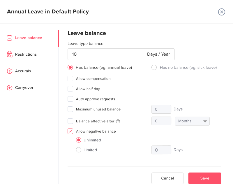 • Automatic balance checks: Employees can only request days they actually have available, unless your company allows going into a negative balance.