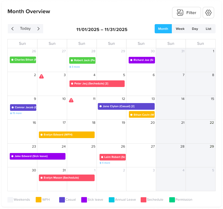 • View different leave types in distinct colors, making it simple to understand the schedule.