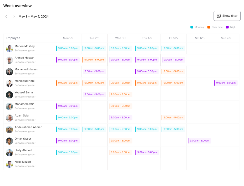 • Support for global and hybrid teams: Employees in different countries or time zones can each have a personalized schedule that reflects their own workweek.